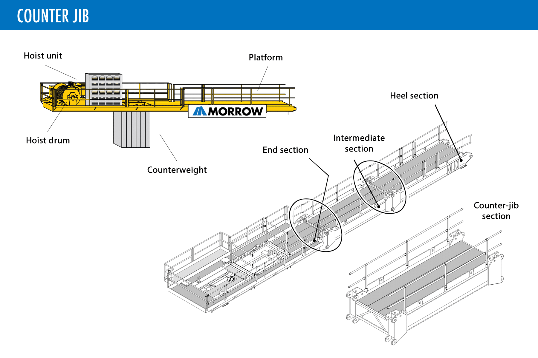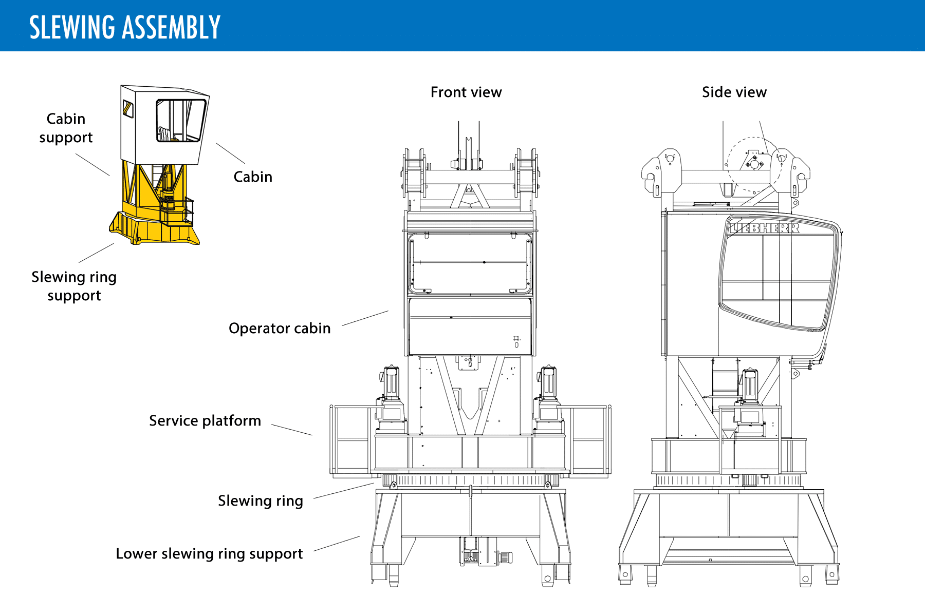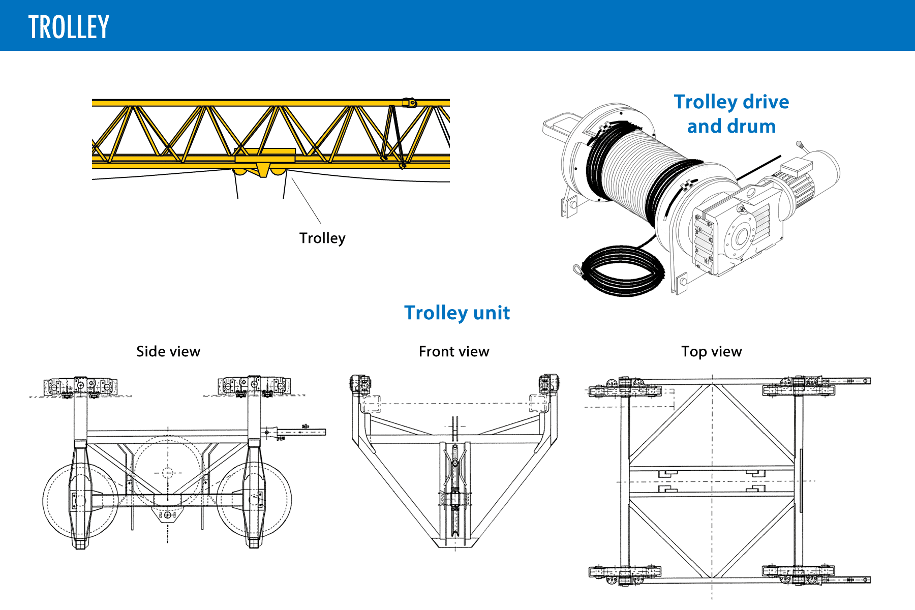 Tower cranes are seen on almost every major construction site throughout the world. These machines are built to lift heavy loads efficiently and safely. A modern tower crane consists of three major sections: the base, the tower mast, and the slewing unit. Roll-over the diagram below to learn more about major components of a tower crane. +Video | NEXT »