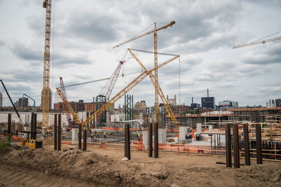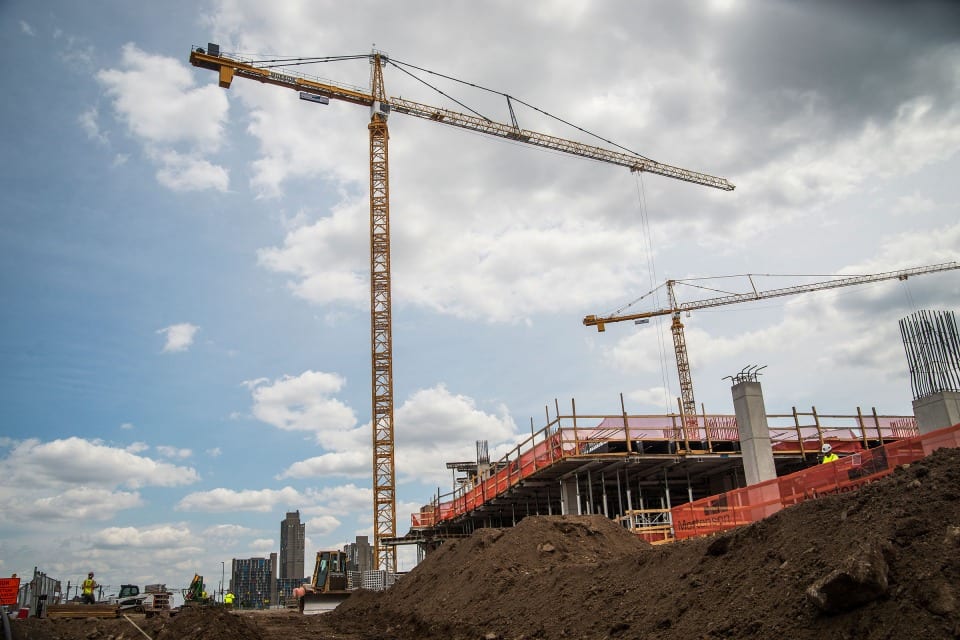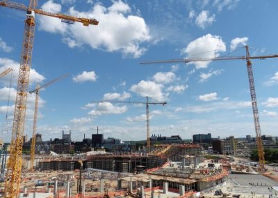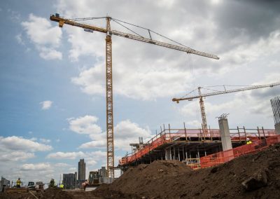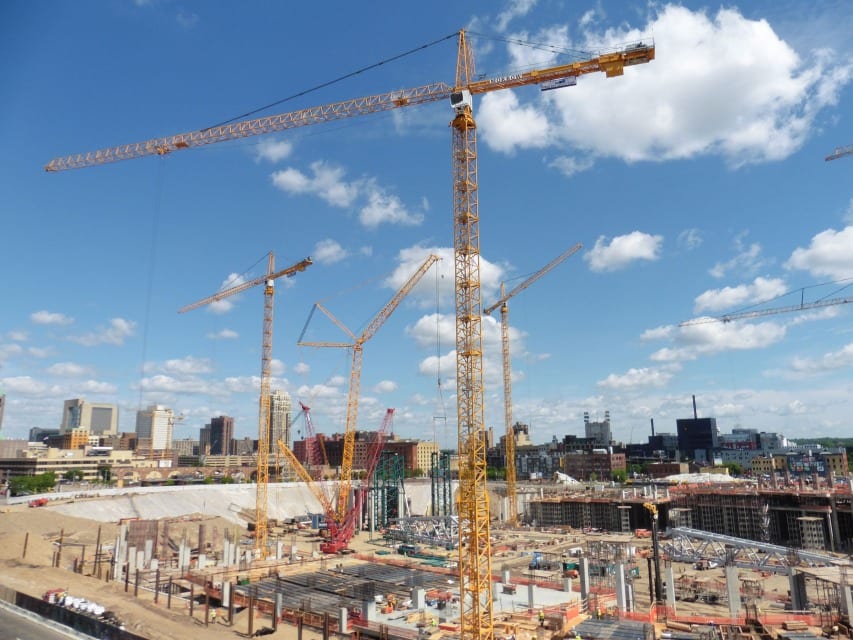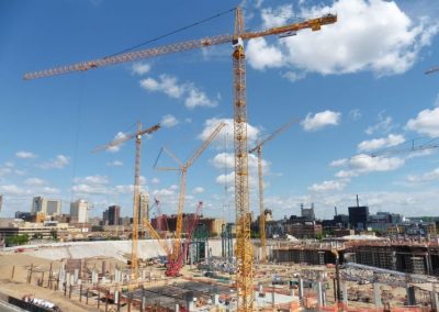 After Mortenson was awarded the NFL Minnesota Vikings stadium project, they contacted our St Louis district office to fulfill their need for a versatile and reliable lifting solution. Morrow Sales and Engineering provided a plan for Mortensen project managers that included a range of tower crane capacities from the 316 EC-H up to the 630 EC-H. In all, 5 Liebherr hammerhead tower cranes were employed on this $1.027 billion dollar project. The stadium is scheduled to open on time for the 2016 NFL season due in part to these reliable machines with responsive support from Morrow service at our St Louis and Chicago districts.