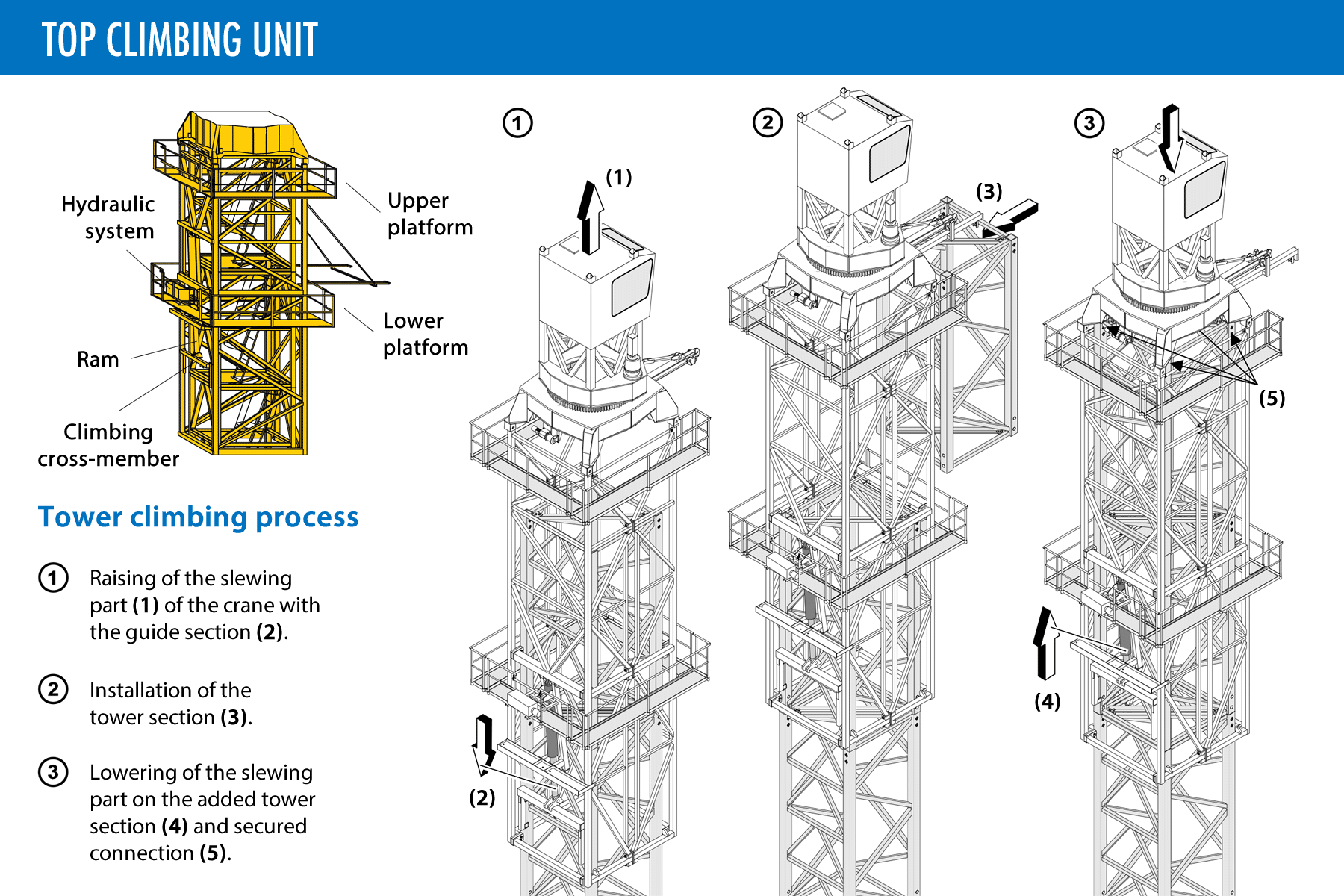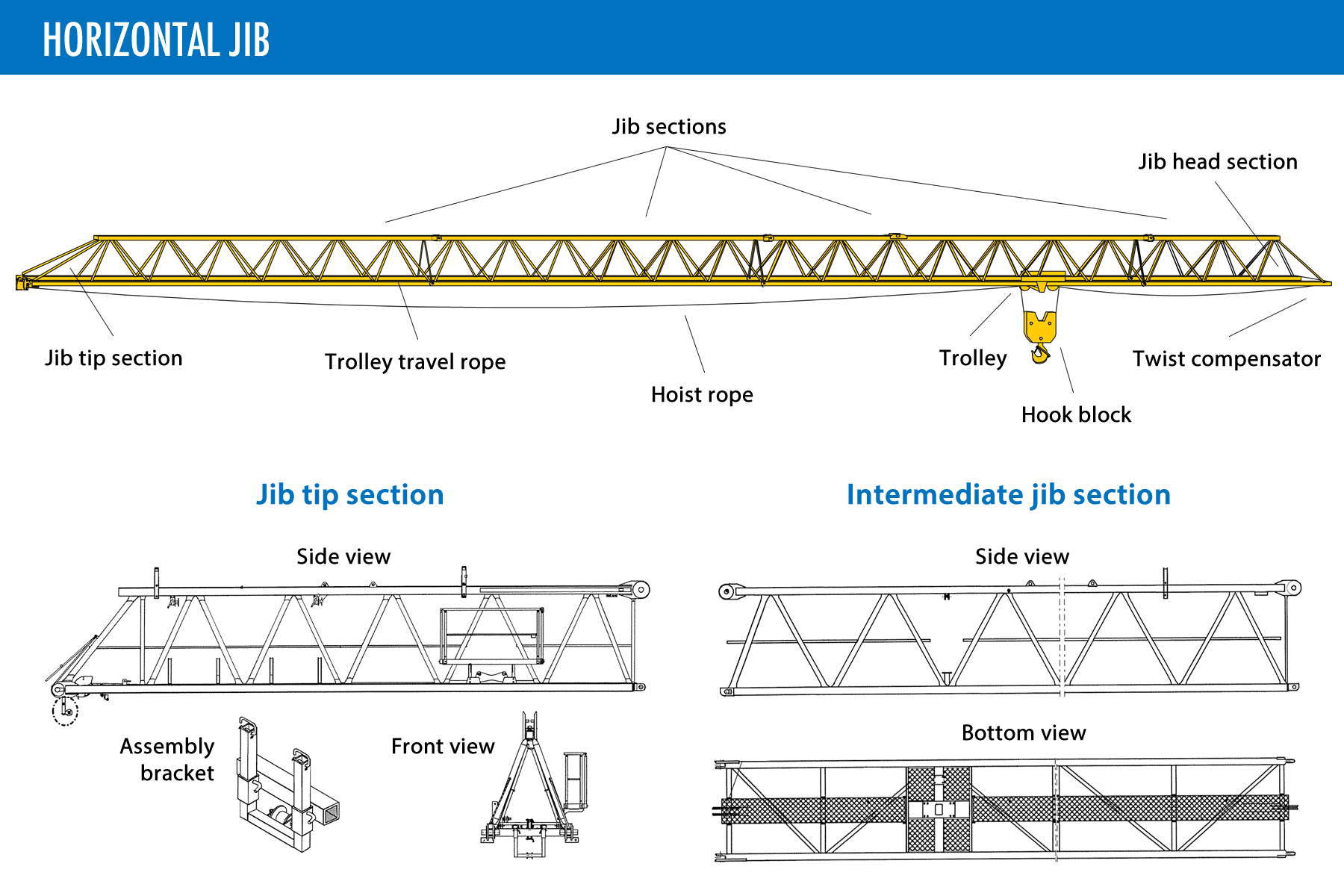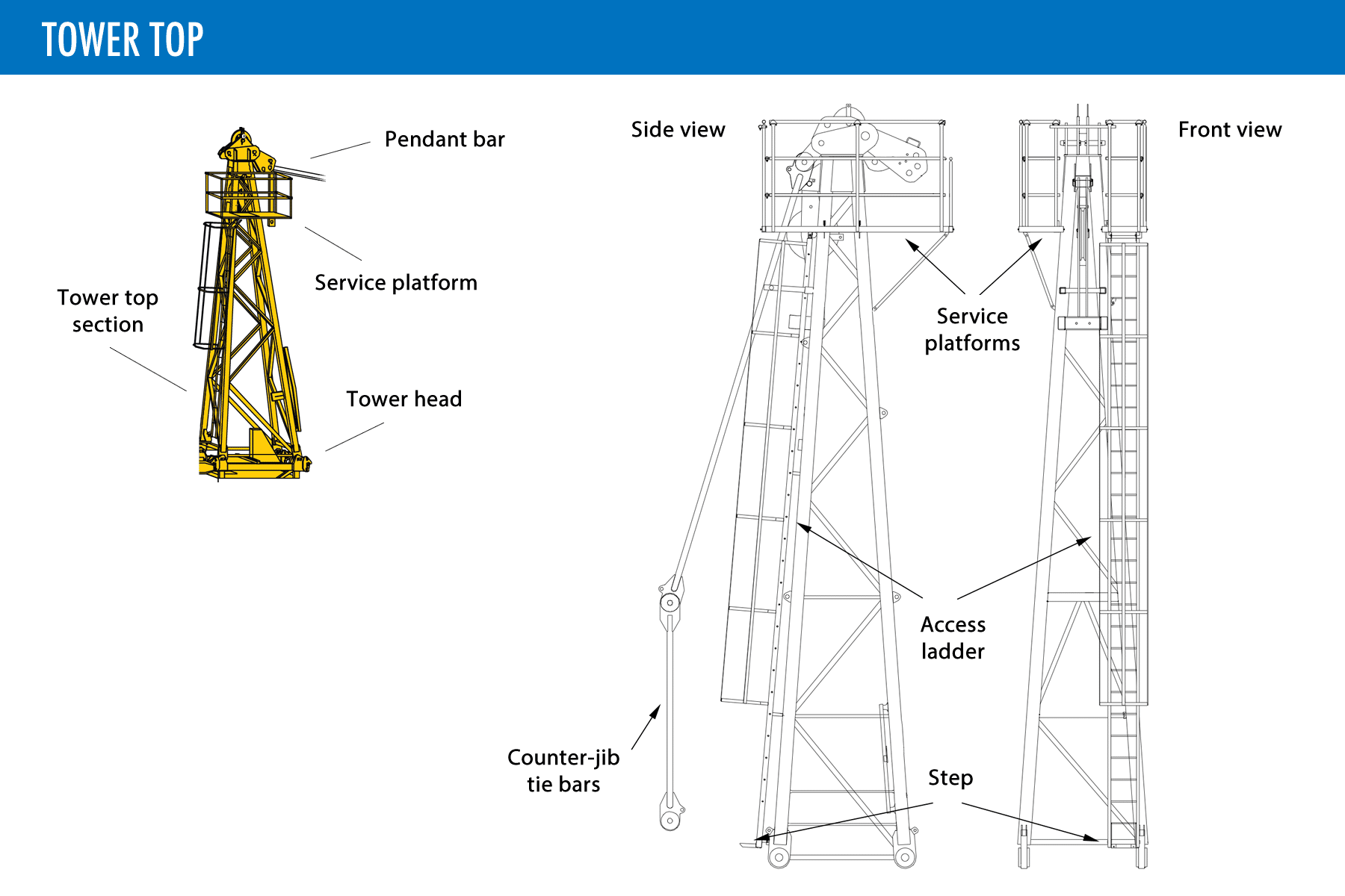 Tower cranes are seen on almost every major construction site throughout the world. These machines are built to lift heavy loads efficiently and safely. A modern tower crane consists of three major sections: the base, the tower mast, and the slewing unit. Roll-over the diagram below to learn more about major components of a tower crane. +Video | NEXT »