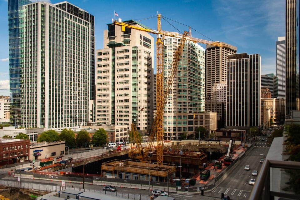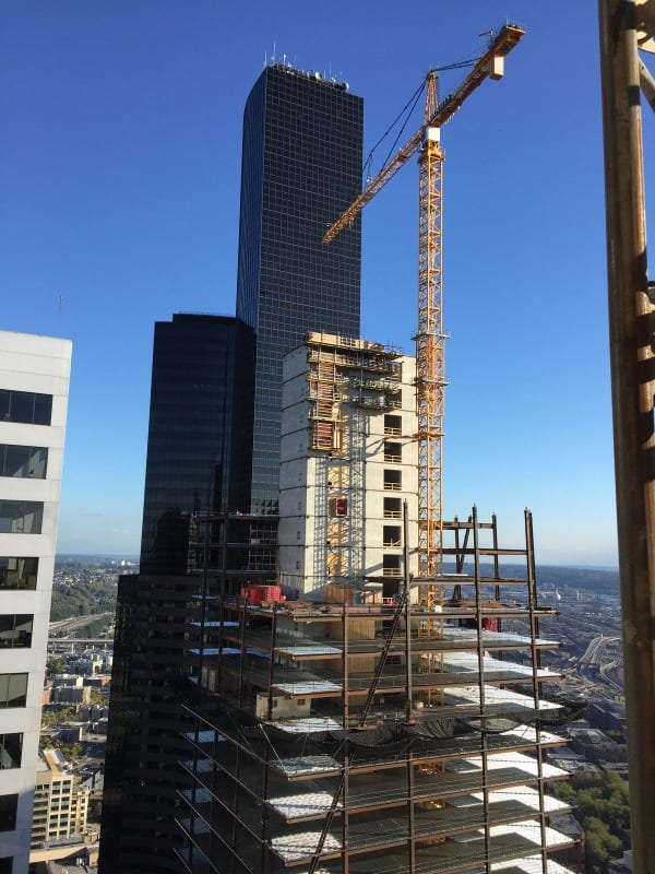 Many of the new commercial and residential high-rises utilize either the Liebherr 316 EC-H or 420 EC-H tower cranes, as can be seen in the accompanying panoramic image. The Alimak FC 7100-12 construction hoist can be seen throughout the Seattle-metro area and is a reliable choice for contractors to deliver workers and materials. Contractors are beginning to employ the luffing boom class of tower cranes such as the 540 HC-L and 542 HC-L. As Seattle’s urban core increases in density we expect the luffers to become a common site on the horizon.