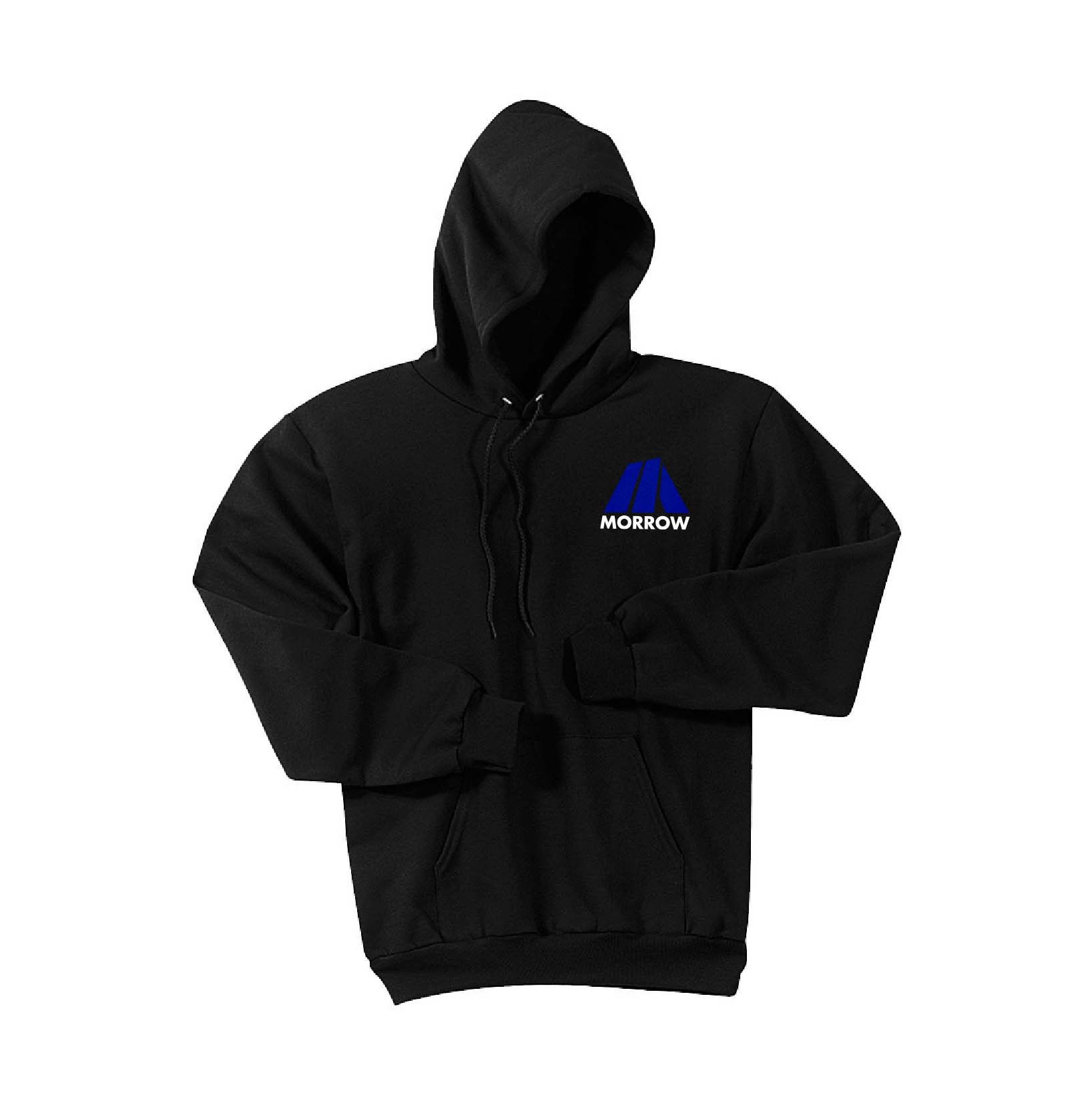 - Port & Company™ brand jet-black hooded sweatshirt with silver Morrow logo screened on front and back.