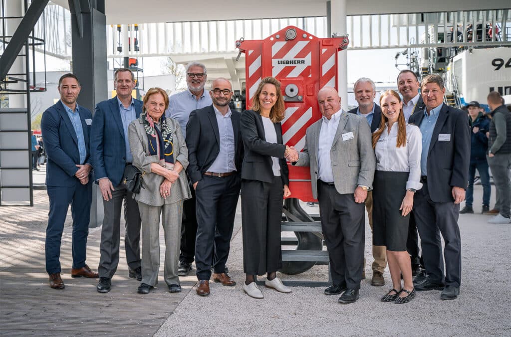 From left to right: Andrew Stalter (Business Development Manager Morrow Equipment Company), Michael Heacock (Vice President of Sales Morrow Equipment Company), Isolde Liebherr (Member of the administrative board at Liebherr-International AG, Chris Smith (Vice President of Service Morrow Equipment Company), Marco Guariglia (Managing Director Liebherr Tower Cranes), Stefanie Wohlfarth (Vice president of the administrative board at Liebherr-International AG), Peter Juhren (President and Chief Operating Officer Morrow Equipment Company), Andrew Morrow (Morrow Equipment Company), Olivia Morrow (Morrow Equipment Company), Stefan Brandt (Divisional Manager Liebherr), John Mader (Morrow Equipment Company)